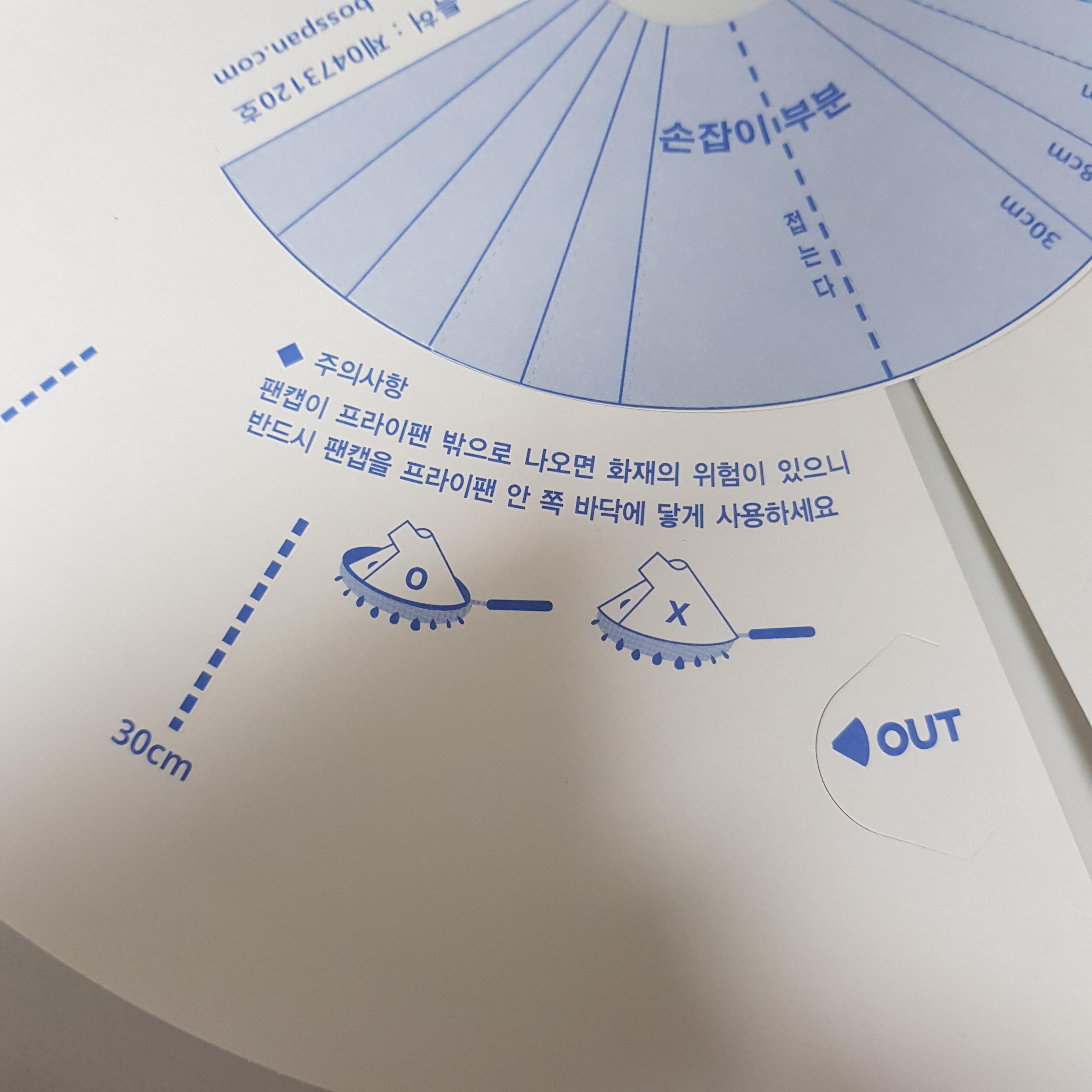 ▲ 주의사항도 나와있는데, 저 동그라미 표시가 되어있는 것 처럼 프라이팬 안으로 팬캡 뚜껑이 모두 들어가야 안전함. x표시 나와있는 것처럼 저렇게 사이즈를 크게 만들면 불이 붙을 위험이 있고, 실제로 나도 고기 굽다가 불붙은 적 있었음;;